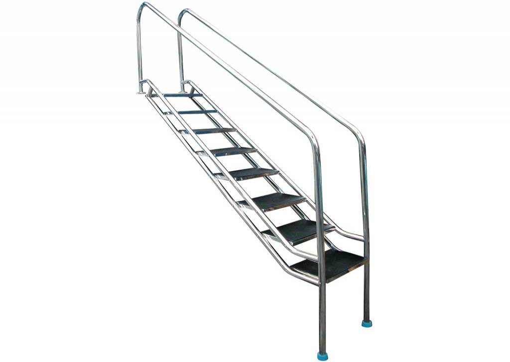 Genişlik 970 mm. Kollar Ø 42 mm AISI 304 paslanmaz çelik borudan, paslanmaz çelik çerçeveli – kaymaz polyester basamakları, plastik ankrajları ve rozetleri ile komple.